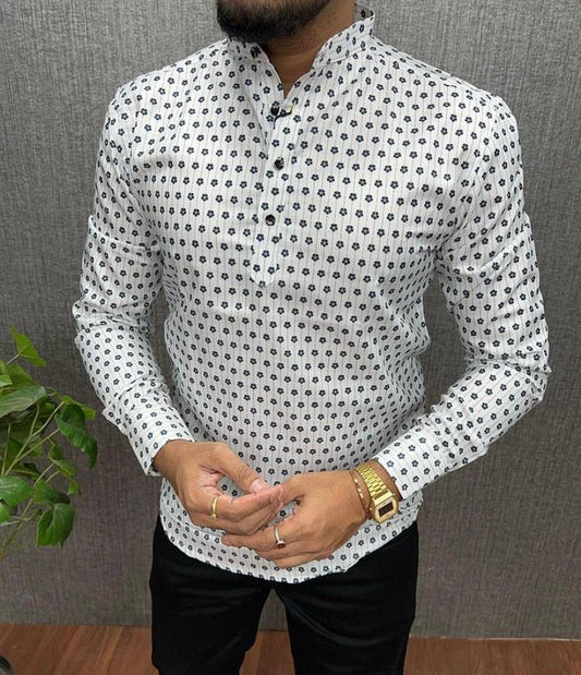 White Printed Short Kurta for men