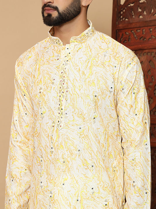 Yellow Linen Cotton Printed With Embroidery Work Kurta For Men