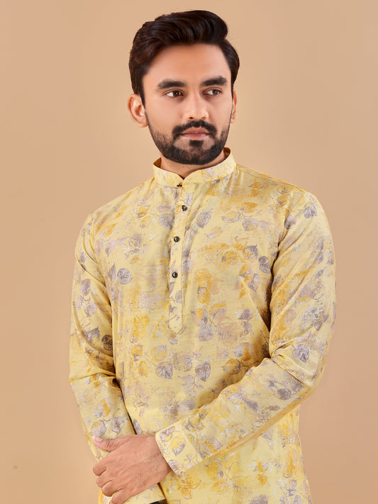 Manzar Yellow Cotton Foil Printed Kurta Pyjama for Men