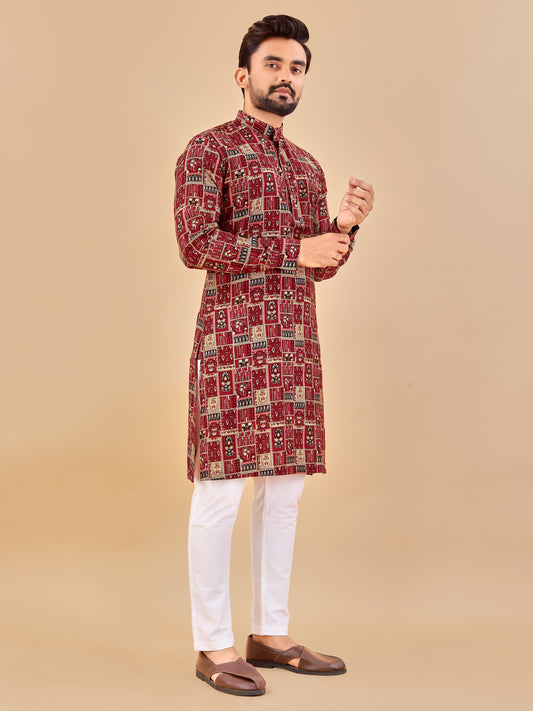 Manzar Rama Red Cotton Foil Printed Kurta Pyjama for Men
