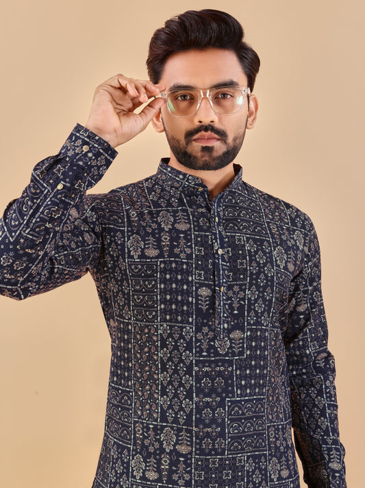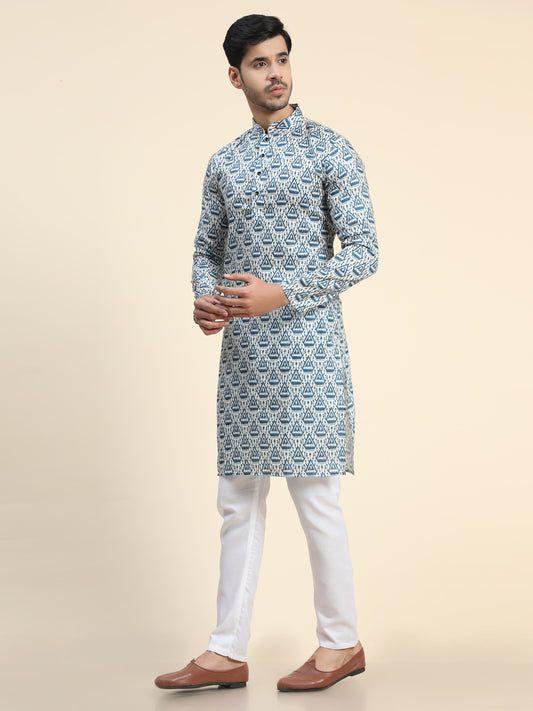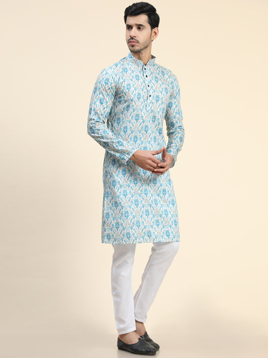 Manzar Blue Cotton Foil Printed Kurta Pyjama for Men