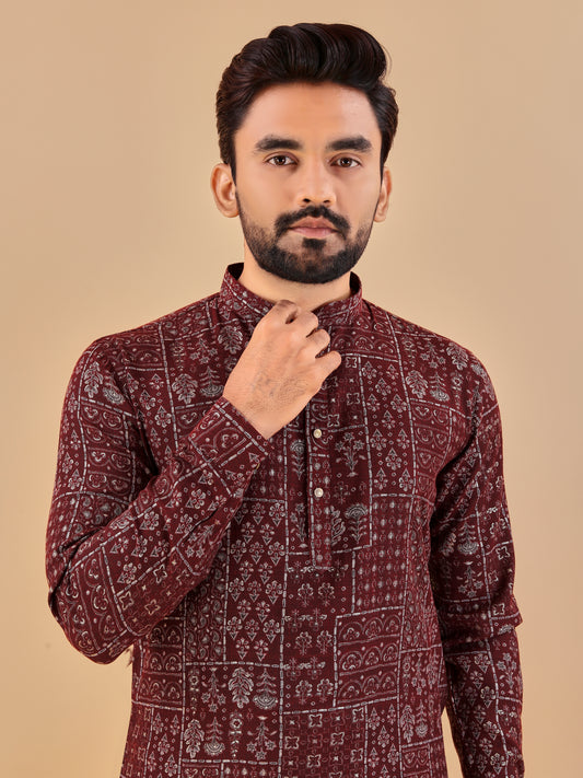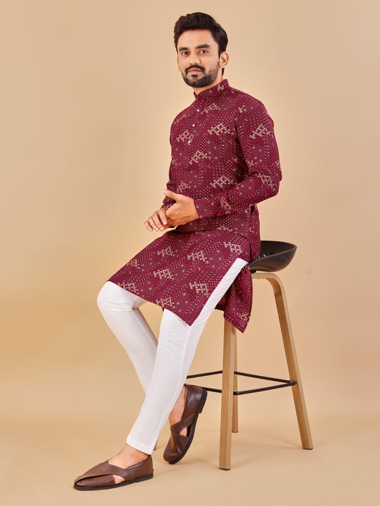 Manzar Maroon Cotton Foil Printed Kurta Pajama for Men