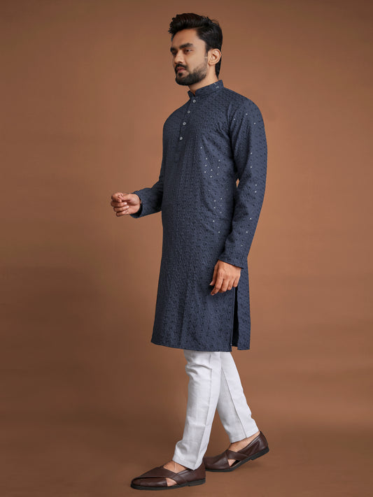 Manyawar Grey Embroidery Sequence Kurta Pyjama for Men
