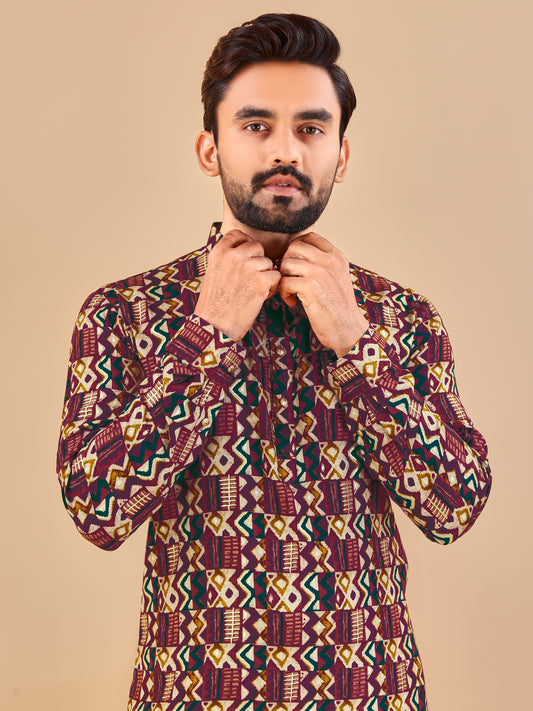 Manzar Wine Cotton Foil Printed Kurta Pyjama for Men